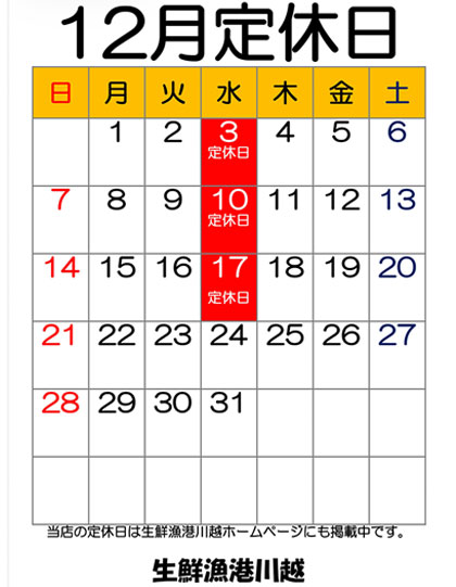 生鮮漁港川越年末年始営業のお知らせ